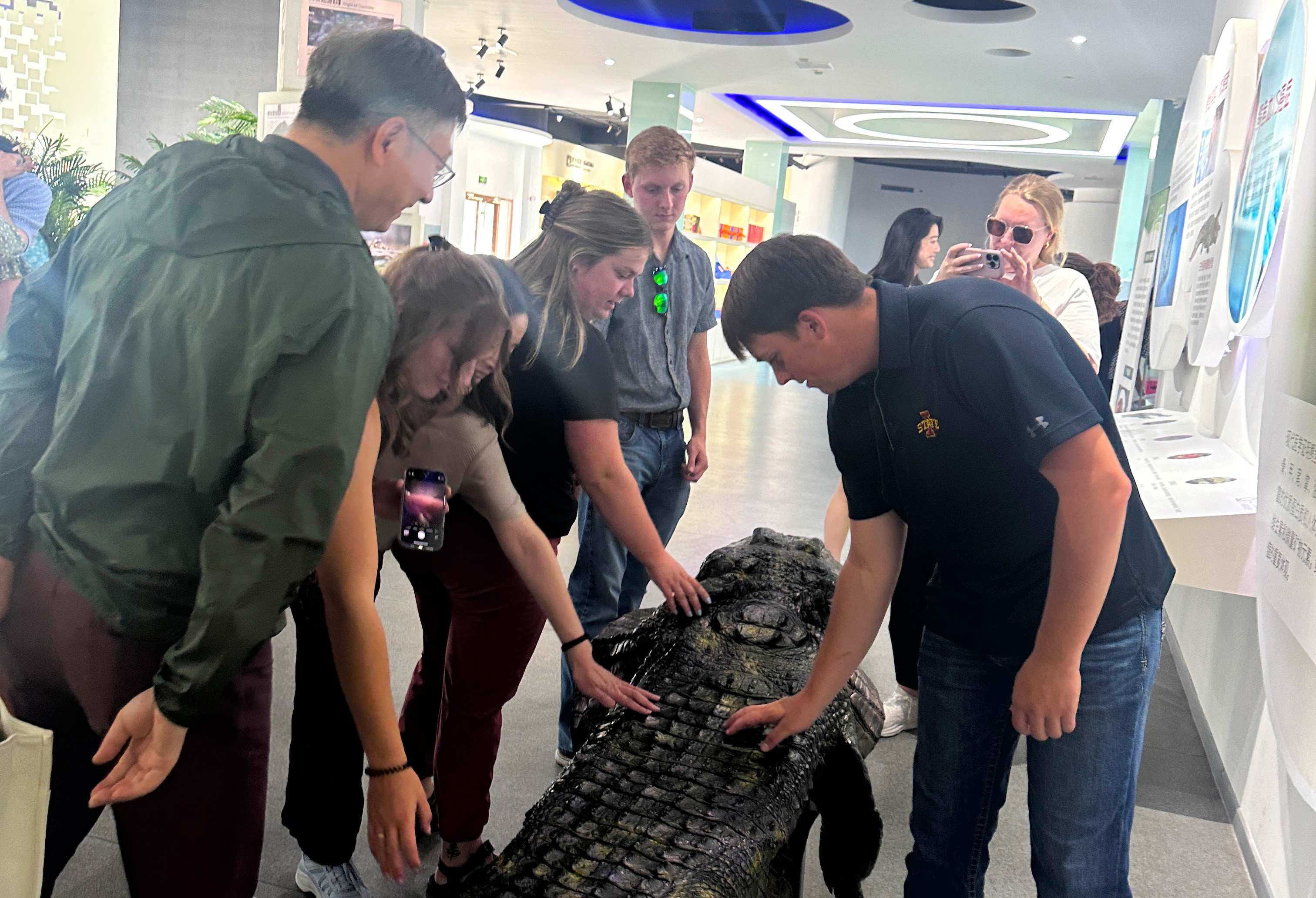 随后,代表团还打卡了蛋鸡场的配套项目365英国上市公司泰鳄养殖基地。讲解员刘明宇介绍,该基地养殖鳄鱼4000条,用于消纳蛋鸡场的淘汰鸡,改变了传统的把淘汰鸡焚烧或深埋而造成环境污染的旧做法,并衍生出一系列高附加值鳄鱼商品,吸引代表团成员纷纷选购留念。蛋鸡场每天产生的鸡粪还可以加工成有机肥,用于平谷大桃种植。整个300万只现代化蛋鸡产业项目,形成了“蛋鸡-鳄鱼-大桃”种养结合的生态循环可持续发展模式,既提升了资源利用率,又是环境友好型。